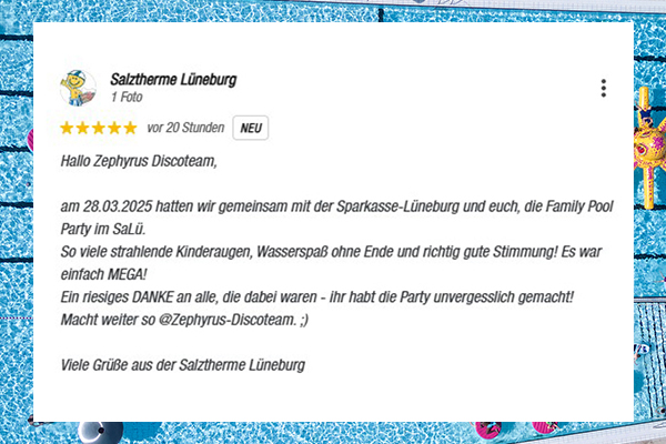Auf unserer Facebook-Seite können Sie den gesamten Beitrag lesen und sich viele Fotos anschauen. Und wenn Sie nun denken:“ So eine großartige Party … genau das wäre doch was für Ihr Freizeitbad …“, dann rufen Sie uns an oder schicken uns eine Mail. Vielleicht macht das ZEPHYRUS-DISCOTEAM dann auch bald bei Ihnen Station und begeistert Ihre jungen Besucher.