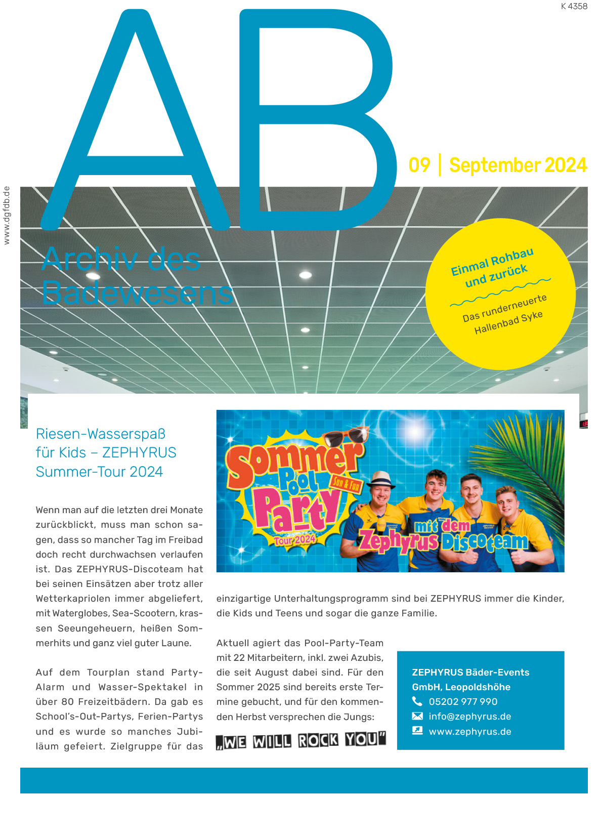 In der aktuellen Ausgabe des „Archiv des Badewesens“ findet sich ein Bericht über die Zephyrus-Pool-Partys im Sommer 2024.