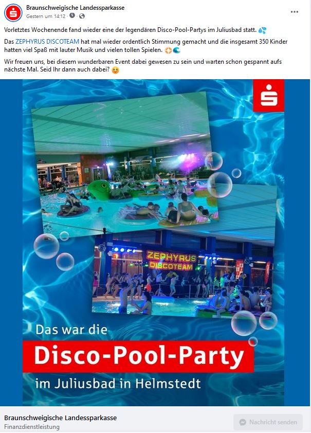Seit 14 Jahren feiern wir mit der Bäder- und Dienstleistungsgesellschaft Helmstedt mbH und der Braunschweigischen Landessparkasse 1 x pro Jahr eine ZEPHYRUS-Pool-Party im JULIUS BAD in Helmstedt.