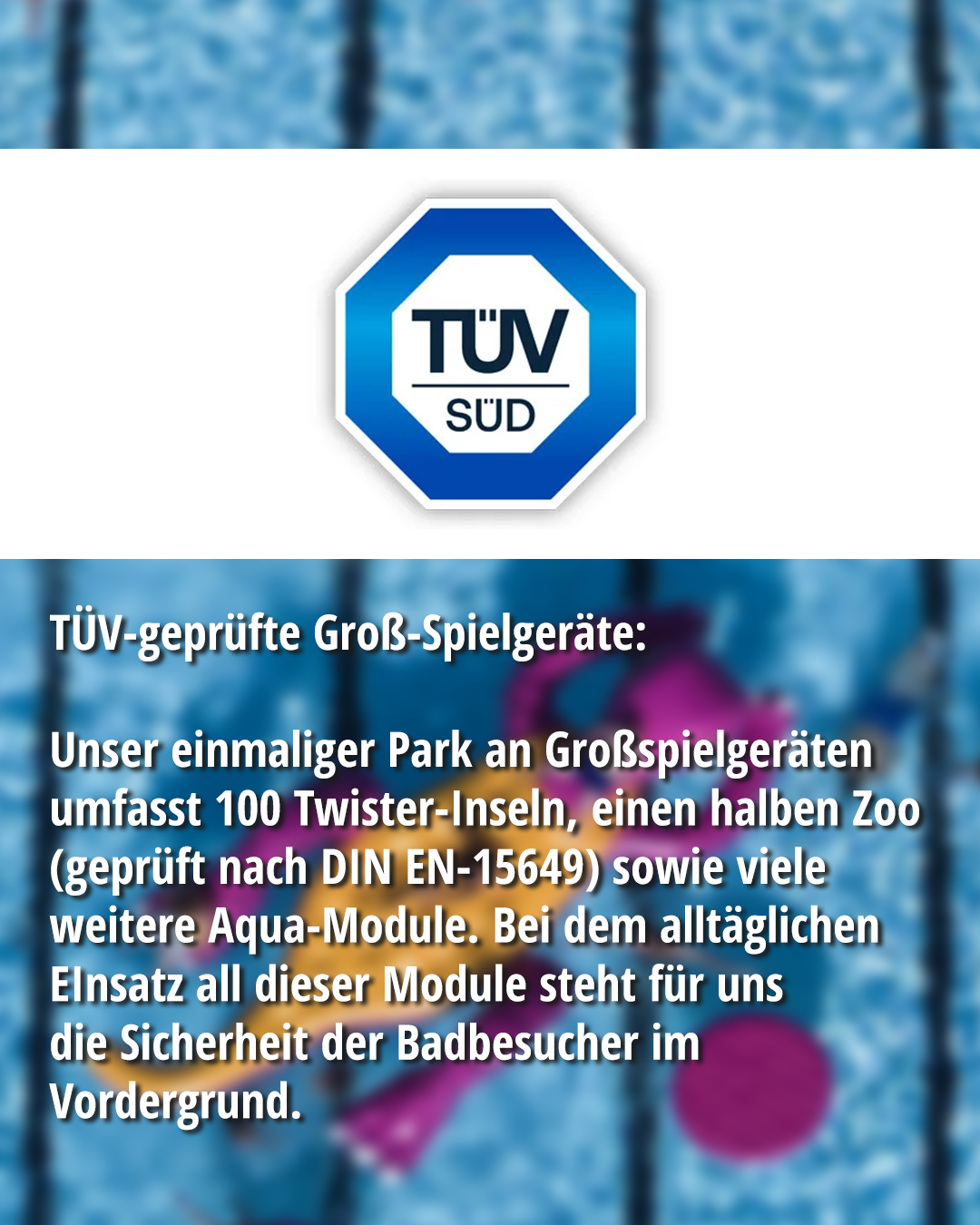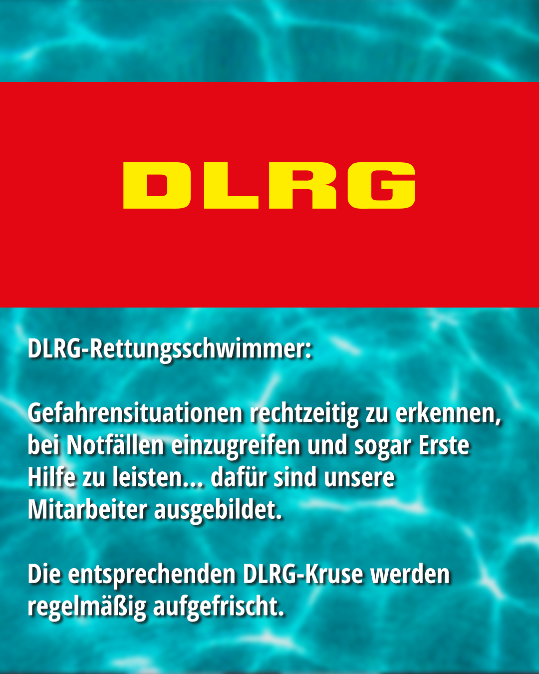 Zwei Dinge gehören für uns zu einer nachhaltig erfolgreichen Pool-Party. Als erstes natürlich ein Partyprogramm, das Ihre Gäste begeistert und als Zweites das Thema SICHERHEIT während des Events – im Becken und drumherum. Wir stellen Ihnen hier die 4 wichtigsten Eckpfeiler vor: TÜV | E-CHECK | ASB | DLRG